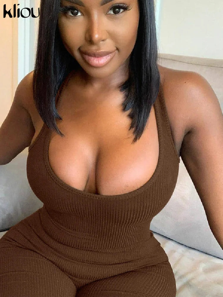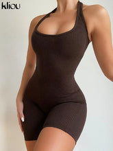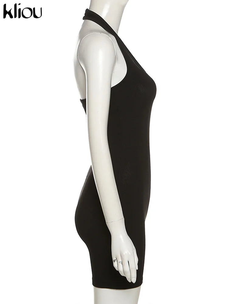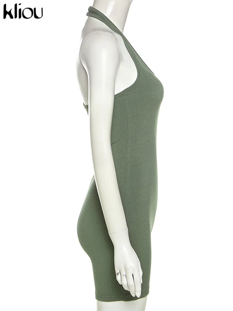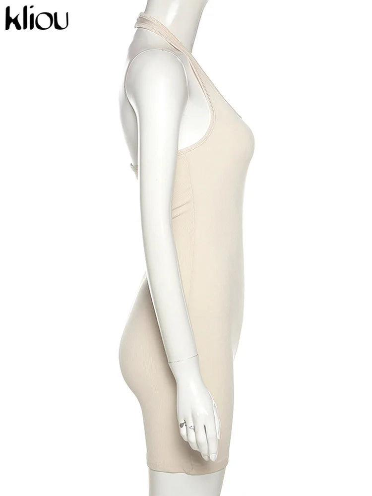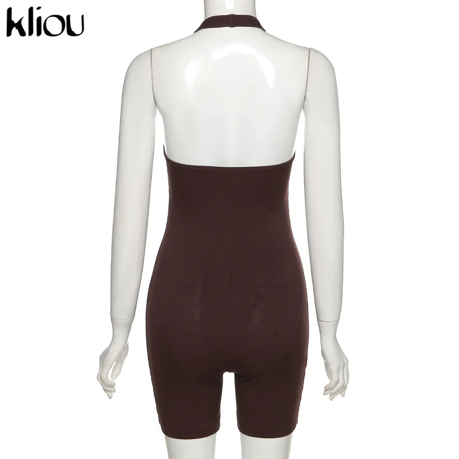 Kliou Striped Sporty Workout Halter Rompers Women Casual Active Wear Backless Sleeveless Playsuit Athleisure Biker Playsuits