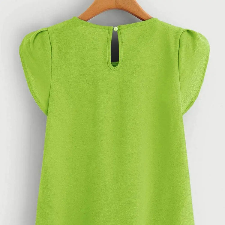The loose cut and elastic material ensure a flattering fit for all body types. Featuring an elegant design with a round neck, petal sleeves, and button detailing on the back, this top exudes simplicity with a touch of sophistication.