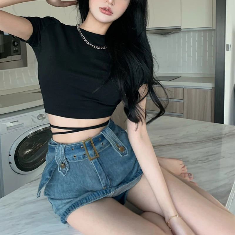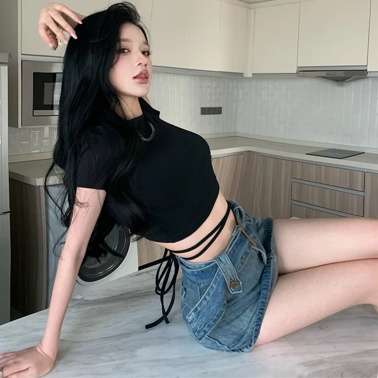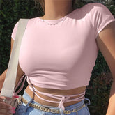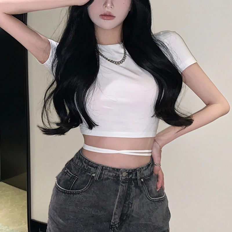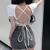 Summer 2022 Sexy Party Short Sleeve Tops Women Backless Hollow Out Short Crop Tops Camisoles Streetwear White Lace Up Crop Tops