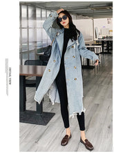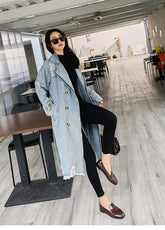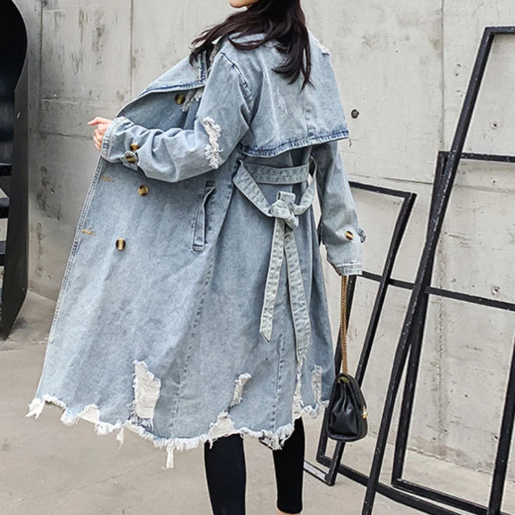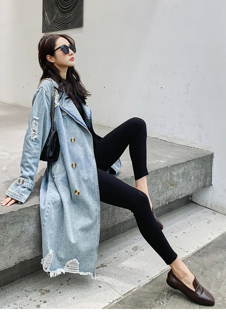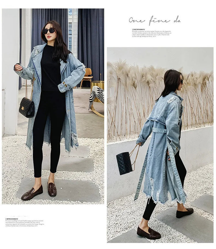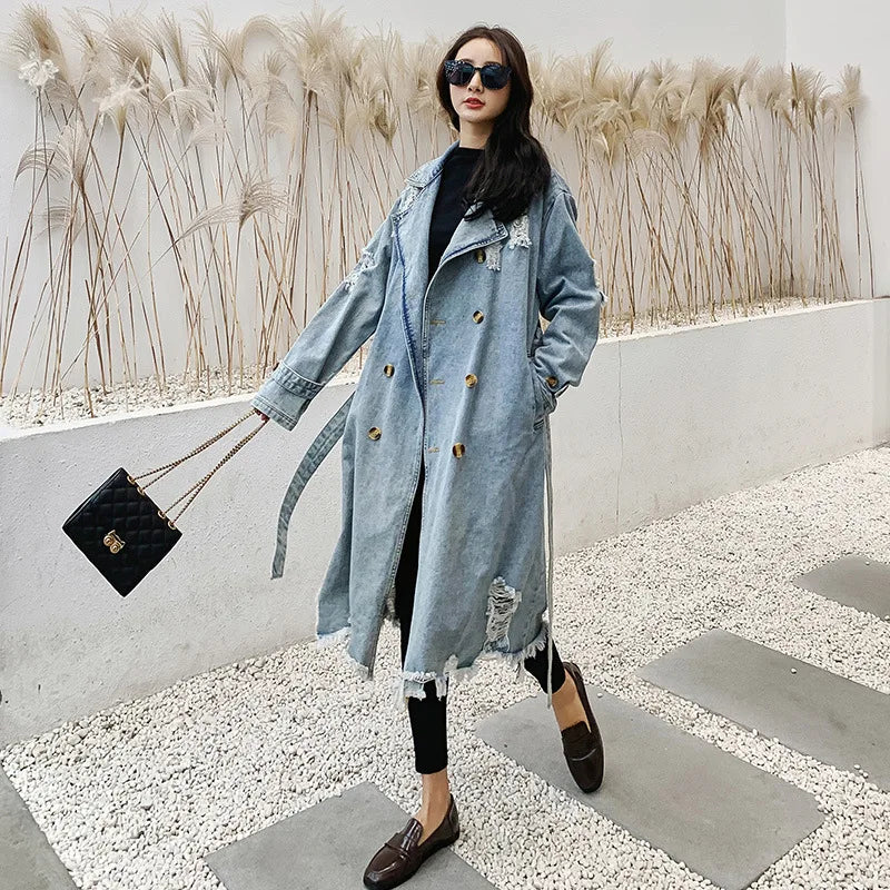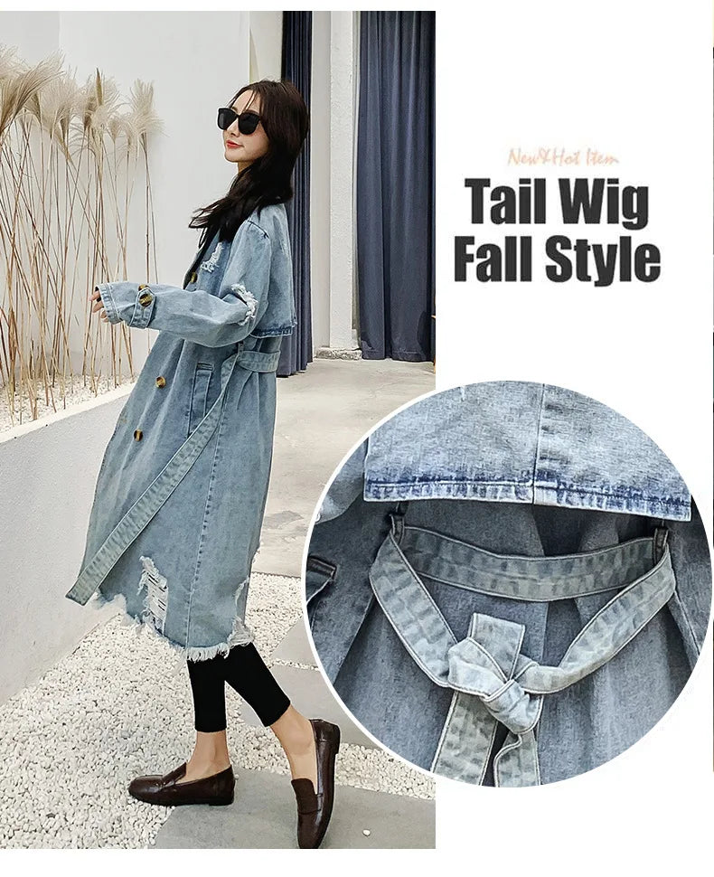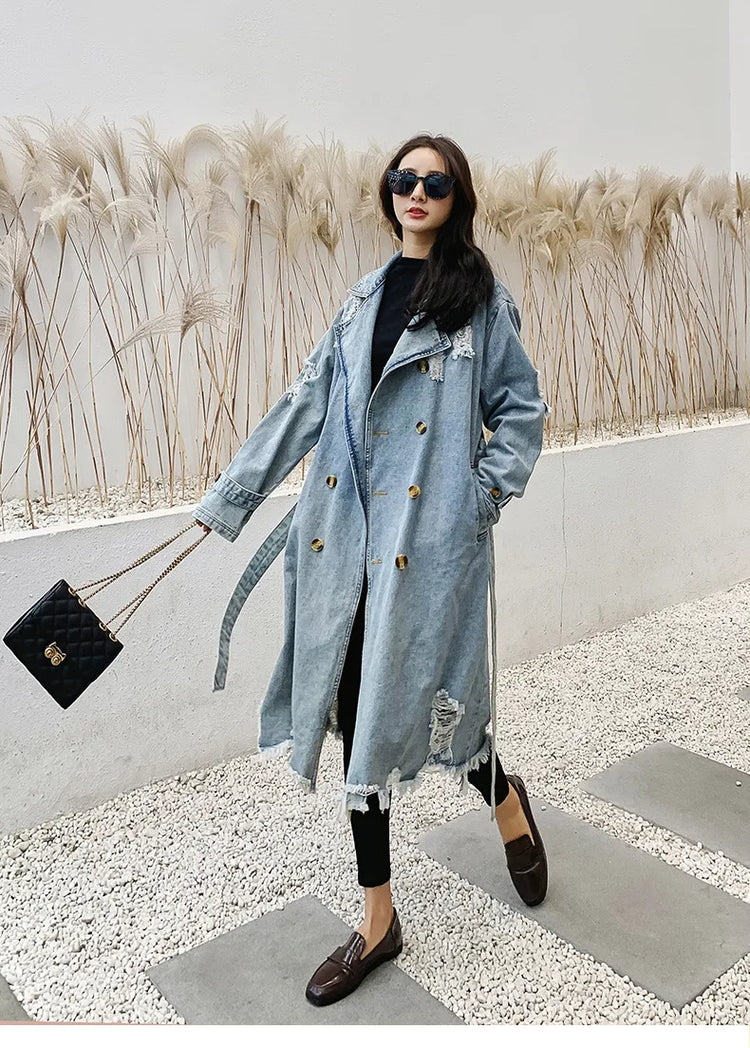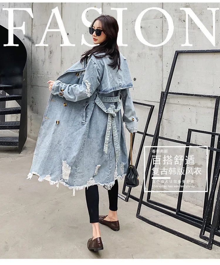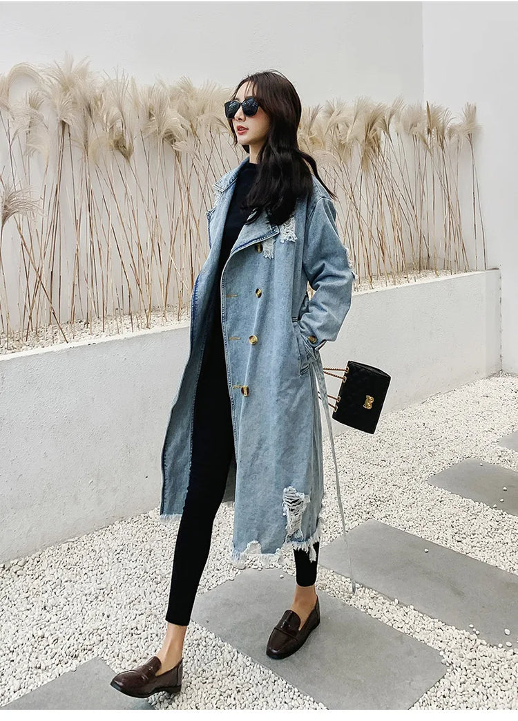 Trench Denim Coat Women Mid Length Coats Y2k Hole Turn Down Collar Jackets Maxi Lace Up Tight Waist Elegant Long Autumn Winter