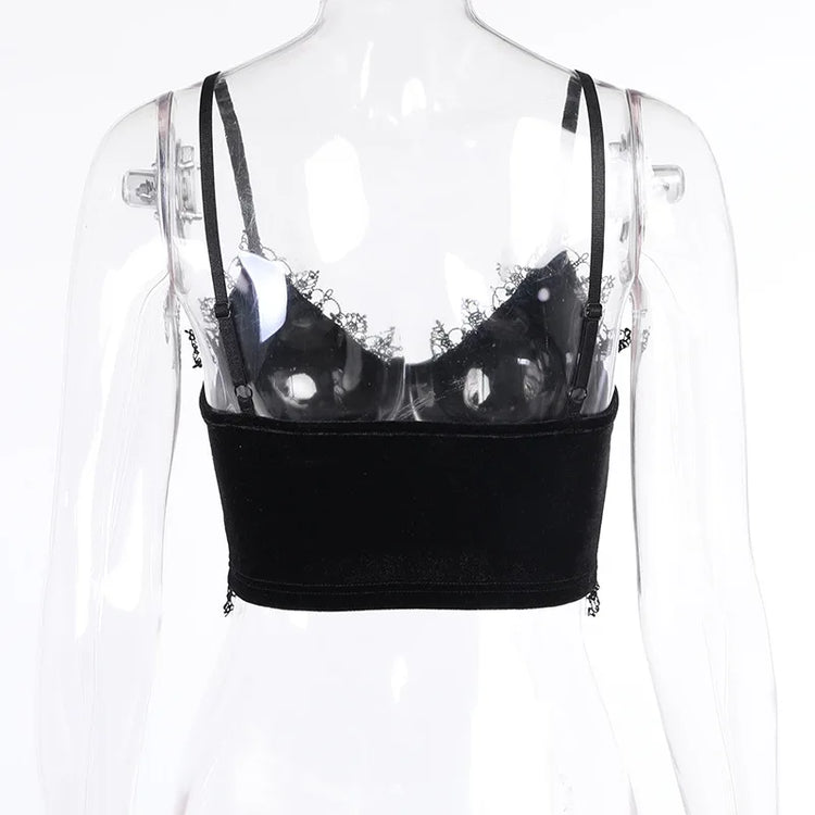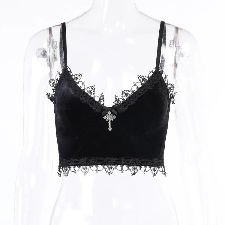 Velvet Mall Goth Crop Tops Black Lace Trim Emo Alternative Aesthetic Crop Tops Women Backless Sexy Strap Tanks