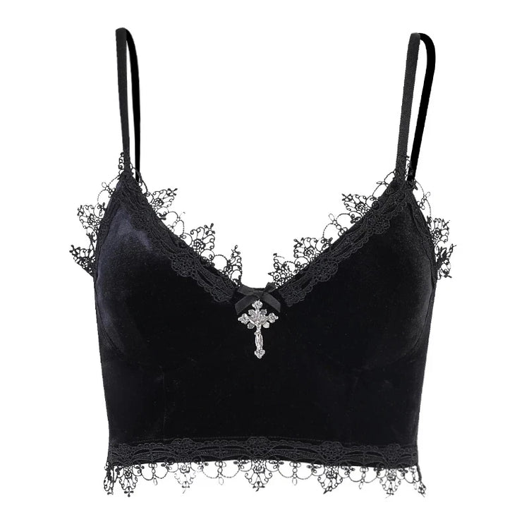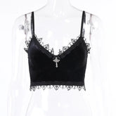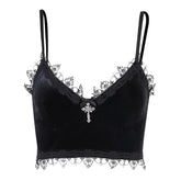 Velvet Y2K Mall Goth Crop Tops Black Lace Trim Emo Alternative Aesthetic Crop Tops Women Backless Sexy Strap Tanks